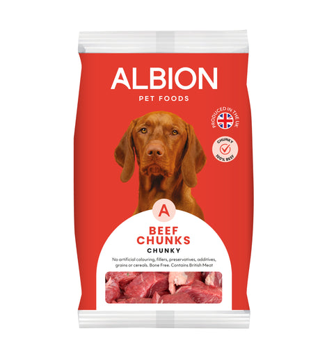Large chunky bite-sized pieces of raw beef which can be added to a raw home prepared diet for working dogs or given as a tasty treat to larger dogs – something to get their teeth into.