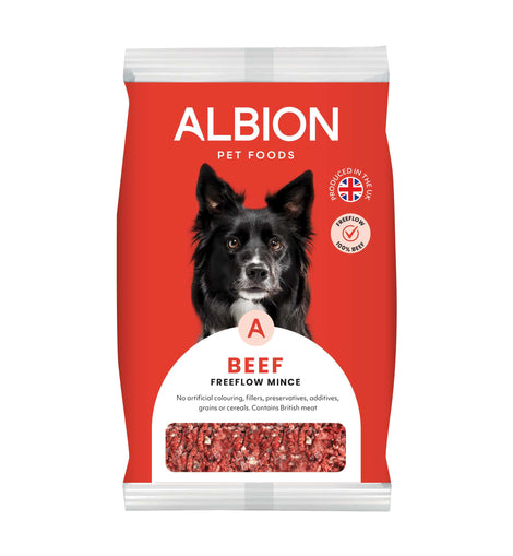Albion Freeflow Beef contains premium raw minced beef, which is a perfect complementary feed specially formulated  for working and assistance dogs. This can be fed alone or combined with other ingredients such as offal, bone and vegetables to ensure your dog has a delicious, nutritious home made raw meal.