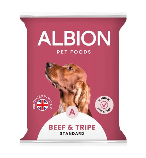 Albion Standard Minced Beef & Tripe raw dog food, made from 50% minced Beef and 50% minced Tripe, is a complementary feed for working dogs, also suitable for all carnivores.