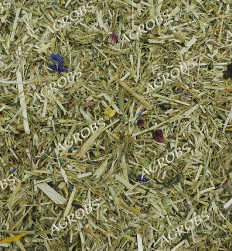 Green oats, Straw, Meadow grasses and herbs, Nettle, Ginkgo, Carrot cubes, Rosehip peel, Parsnip cubes, Beetroot, Raspberry leaves, Blackberry leaves, Cornflower blossoms.