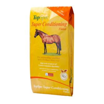 The typical ingredients in TopSpec Super Conditioning Flakes are micronised flaked naked oats, micronised full fat flaked soya beans (GM), molasses, mineral premix, glucose syrup.