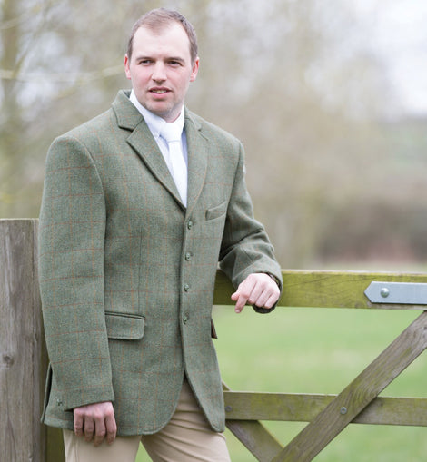 Exclusive Equetech® Green herringbone mens tweed jacket with autumnal Green and Copper over checks.Features flap pockets with concealed zips, rich gold Equetech® jacquard lining, Teflon® coating for showerproof finish and double back vents.