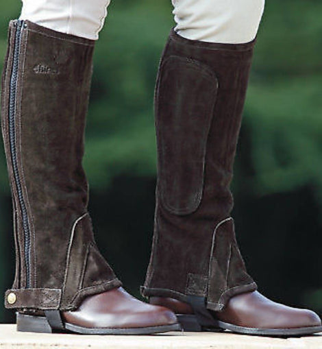 Shires Moretta Suede half chaps are stylish suede chaps with ripple elastic calf sections for super fit. These suede chaps also feature an elastic stirrup strap to help keep the chaps in the correct place, zip closure with popper at bottom and double layer calf pads on the inner leg.