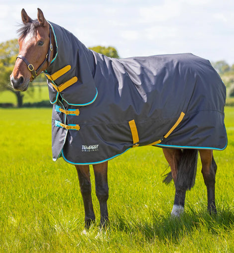 The Tempest Original 300g Combo turnout rug offers excellent winter warmth during cold weather. An integrated contour neck cover makes this an ideal combo for keeping coats clean. The neck fastens with double sided touch close straps. Key features: fully lined, adjustable buckle chest straps, adjustable cross surcingles, fillet strap, tail flap. Technical info: 300g polyfill. 600 denier ripstop outer. Waterproof and breathable. Taped seams. ShireTex® fabric technology. DWR - durable water repellent finish. PFC free.