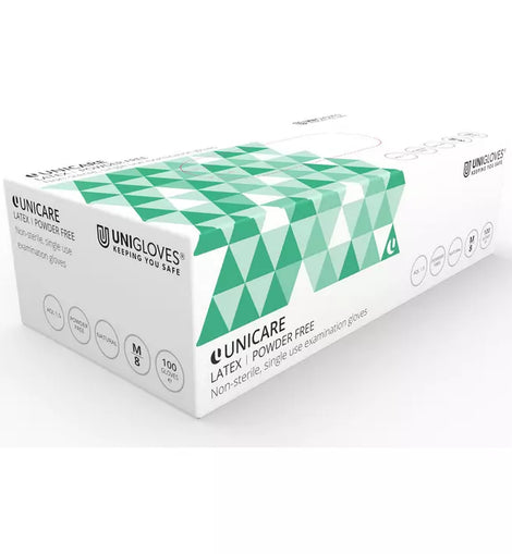 Natural, medium weight latex powder free single use glovesUnicare glove range:The Unicare disposable glove range has been developed to provide exceptional levels of comfort and includes gloves manufactured in nitrile, vinyl, vinyl/nitrile hybrid blend, latex, and polyethylene. Unicare gloves consist of both non-medical and medical grade options which are particularly suited to use in healthcare examination, dental and veterinary care.A glove to suit every need:- Unicare Latex gloves provide an excellent protective barrier due to their durability and integrity while remaining comfortable to wear and easy to put on. Our Unicare range includes powder free and powdered latex, notable for their strength, soft comfort, and consistent grip.- Unicare Nitrile gloves are a great alternative for those that may be prone to skin irritation and allergic reactions. Nitrile gloves offer the same strong durability and superior level of protection as traditional latex gloves with increased tactile sensitivity, tear resistance, and a more comfortable fit. Unicare nitrile gloves are available in packs of 20, 100 and 200 gloves.- Unicare Vinyl gloves are made with a unique low-friction inner polymer coating for smooth donning and are tapered at the wrist to better fit your hand. Unicare vinyl gloves feature beaded cuffs for extra strength and tear resistance.- Unicare Vinyl/Nitrile hybrid gloves resist hydrocarbons found in antifreeze, paint and paint thinners, petrol, oils, and many other products and the blend of nitrile and vinyl makes the glove more comfortable and provides better dexterity than traditional vinyl gloves.